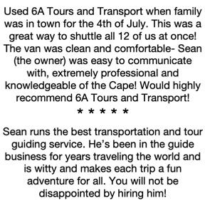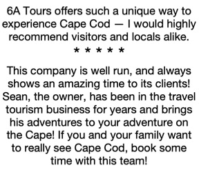 6a Tours and Transport is the only company in New England that offers private, small group customized CAPE COD TOURS. Guests travel in one of our pristine 14 passenger vans. We have designed specialized daily CAPE COD TOURS that are completely customizable and tailored specifically based upon the interests of the group and can be conducted in any order desired. In addition to our daily CAPE COD TOURS, we offer optional activities daily which enhance your CAPE COD TOURS experience. Have a larger group? We can handle up to 55 people. Sean, the owner, will work closely with you to design the perfect CAPE COD TOURS itinerary for you and your group.
